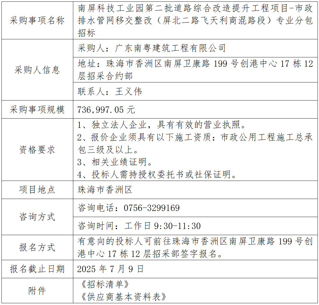南屏科技工業(yè)園第二批道路綜合改造提升工程項目-市政排水管網移交整改(屏北二路飛天利商混路段)專業(yè)分包招標 專欄:工程招標 發(fā)布日期: 2025-07-04 作者:招采管理中心 附件:南屏科技工業(yè)園第二批道路綜合改造提升工程項目-市政排水管網移交整改(屏北二路飛天利商混路段)專業(yè)分包招標清單 附件:供應商基本資料表 返回列表 上一篇:南屏科技工業(yè)園第三批道路綜合改造提升工程-移交整改專業(yè)分包 下一篇:鳳凰谷項目高壓線遷改工程-工程資料整理服務(延期掛網)