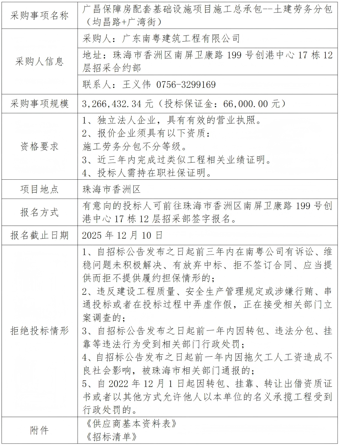 廣昌保障房配套基礎(chǔ)設(shè)施項目施工總承包--土建勞務分包(均昌路+廣灣街) 專欄:工程招標 發(fā)布日期: 2025-12-04 作者:招采管理中心 附件:供應商基本資料表 附件:廣昌保障房配套基礎(chǔ)設(shè)施項目施工總承包--土建勞務分包(均昌路+廣灣街)招標清單 返回列表 上一篇:沒有了 下一篇:廣昌保障房配套基礎(chǔ)設(shè)施項目施工總承包-安保、保潔服務