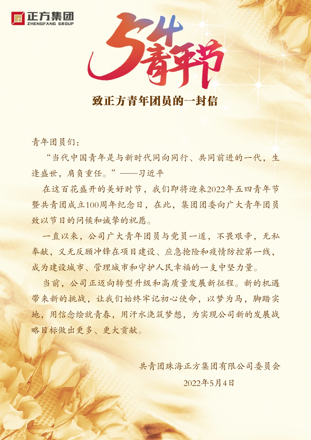 為迎接“五四青年節(jié)”和中國共青團成立100周年的到來,正方集團團委組織了一批優(yōu)秀青年團員拍攝五四青年節(jié)宣傳片,在節(jié)前為廣大青年團員送去節(jié)日的祝福,并發(fā)放了“致正方青年團員的一封信”和共青團團徽,感謝青年團員們?yōu)楣景l(fā)展做出的貢獻,讓青年團員們感受到團組織的溫暖。