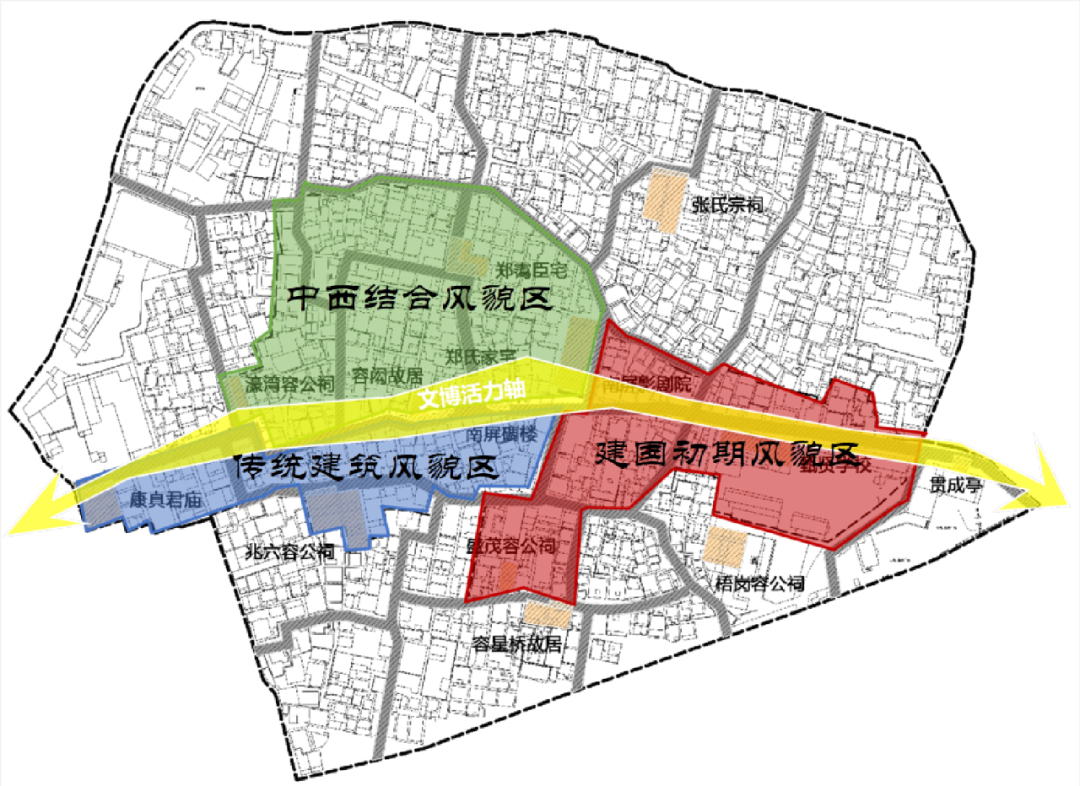 在街區(qū)新格局的引領下,活化利用南屏歷史人文資源,形成三大主題區(qū)域。將歷史文化街區(qū)的活化與文化旅游緊密結合,以“三街串六巷”的現(xiàn)狀格局為基礎,打造留學之旅、冠軍之旅、財富之旅、紅色之旅、藝術之旅和美食之旅六大特色旅游線路和一系列特色文化活動。線路穿過容國團紀念館、張氏公祠、梧崗容公祠、容閎圖書館、甄賢社學舊址等重要節(jié)點。