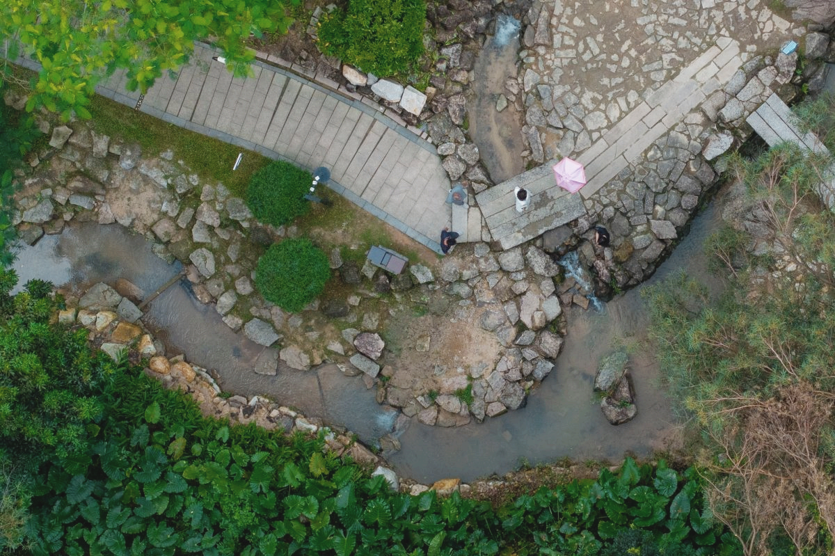 通過科學(xué)規(guī)劃引水造景補水設(shè)計,從山腳水潭抽水至山腰水池,并對水池的水壩頂進(jìn)行精心改造,再現(xiàn)“曲水流觴”古韻,巧妙串聯(lián)起摩崖石刻、鮑俊雕像、鮑俊墓等文化節(jié)點,形成脈絡(luò)清晰的景觀探訪動線。這一設(shè)計不僅為山間增添了靈動的水韻,讓市民游客能夠直觀感受自然之美,更暗合嶺南園林中“理水”的造園精髓,輔以重新整飾的綠植生態(tài)系統(tǒng),讓公園更顯嶺南風(fēng)韻,給人以沉浸式的觀賞體驗。