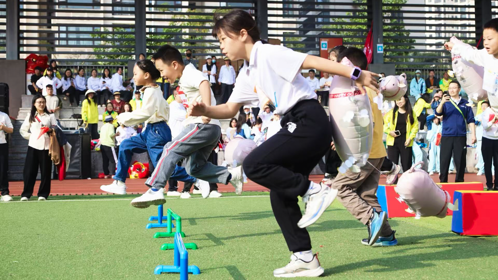 小“豬”零食障礙賽中,孩子們手持卡通氣球,勇闖關(guān)卡,奔向終點(diǎn)零食區(qū)的身影萌趣十足,成為賽場(chǎng)上一道溫馨可愛(ài)的風(fēng)景線。