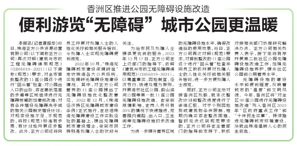 2022年10月,“珠海無障礙城市建設(shè)深調(diào)研組”走訪珠海各大公共場所,實地調(diào)研無障礙設(shè)施建設(shè)情況。其中,對正方公司管養(yǎng)的11座公園提出了無障礙設(shè)施優(yōu)化整改意見。2022年12月,《珠海經(jīng)濟(jì)特區(qū)無障礙城市建設(shè)條例》正式施行,在總結(jié)珠海無障礙建設(shè)工作實踐經(jīng)驗的基礎(chǔ)上,提出無障礙城市建設(shè)理念,受到市民特別是殘障人士的歡迎與關(guān)注。