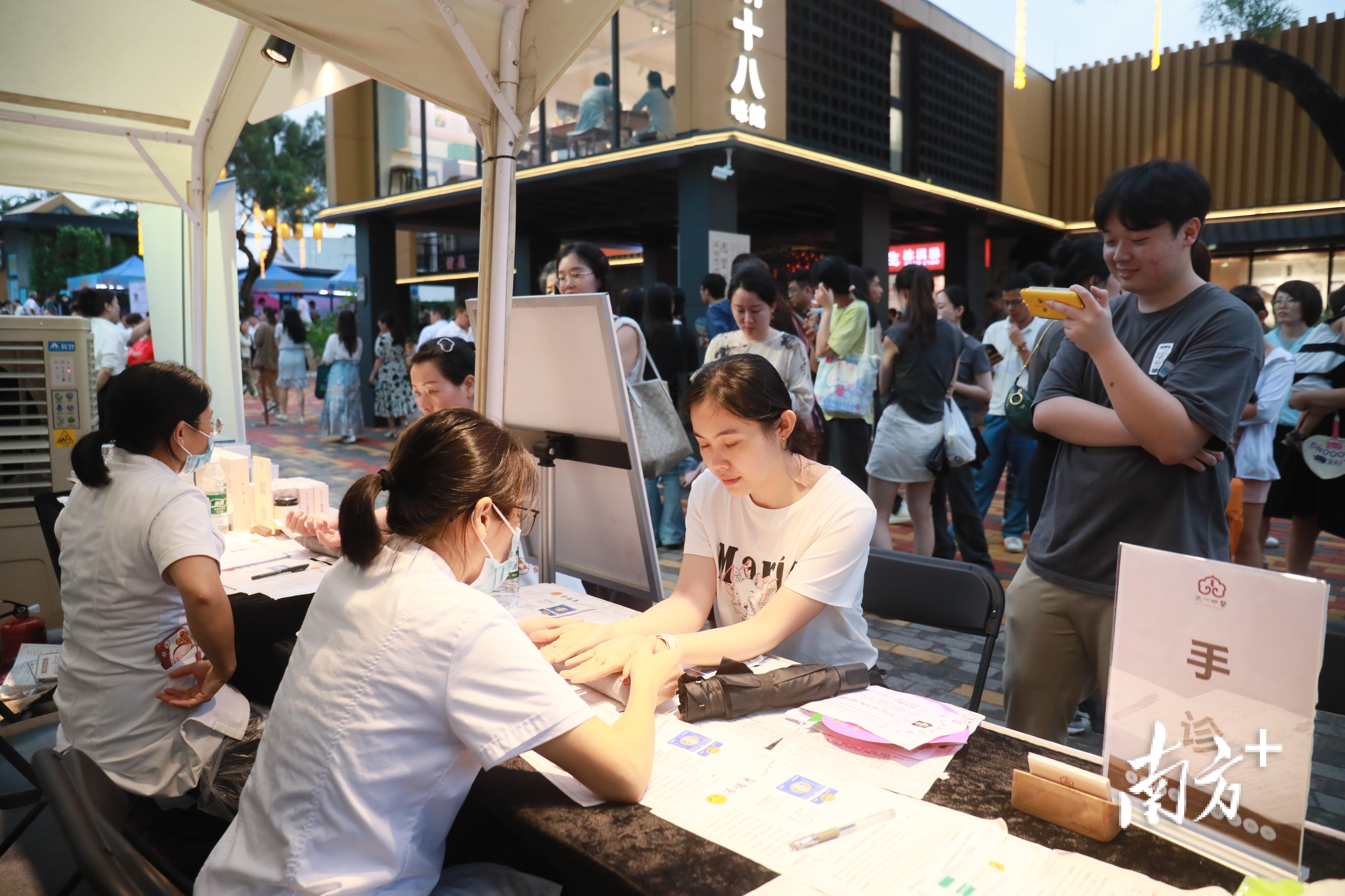 在“中醫(yī)藥一條街”(東街)啟用當(dāng)天,珠海也在此舉辦了“年輕人自己的健康廟會(huì)”,為市民提供特色中醫(yī)診療服務(wù)?;顒?dòng)邀請(qǐng)到廣東省中醫(yī)院珠海醫(yī)院的名醫(yī)專家為市民提供中醫(yī)義診、中醫(yī)藥知識(shí)科普,以及舒筋祛痛、安神助眠、悅顏養(yǎng)膚等非遺特色療法體驗(yàn)服務(wù)。