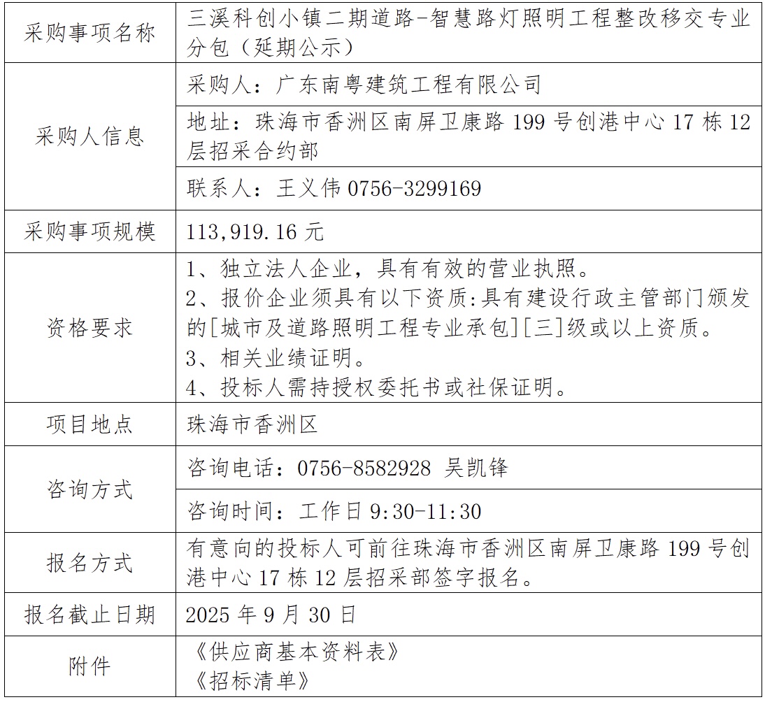 三溪科創(chuàng)小鎮(zhèn)二期道路-智慧路燈照明工程整改移交專業(yè)分包(延期公示) 專欄:工程招標(biāo) 發(fā)布日期: 2025-09-25 作者:招采管理中心 附件:供應(yīng)商基本資料表 附件:三溪科創(chuàng)小鎮(zhèn)二期道路綜合改造提升工程-整改移交工程專業(yè)分包 返回列表 上一篇:G105國道綜合提升工程設(shè)計施工總承包項目-輔道污水外溢及電力排管工程專業(yè)分包 下一篇:三溪科創(chuàng)小鎮(zhèn)二期道路-智慧路燈照明工程整改移交專業(yè)分包